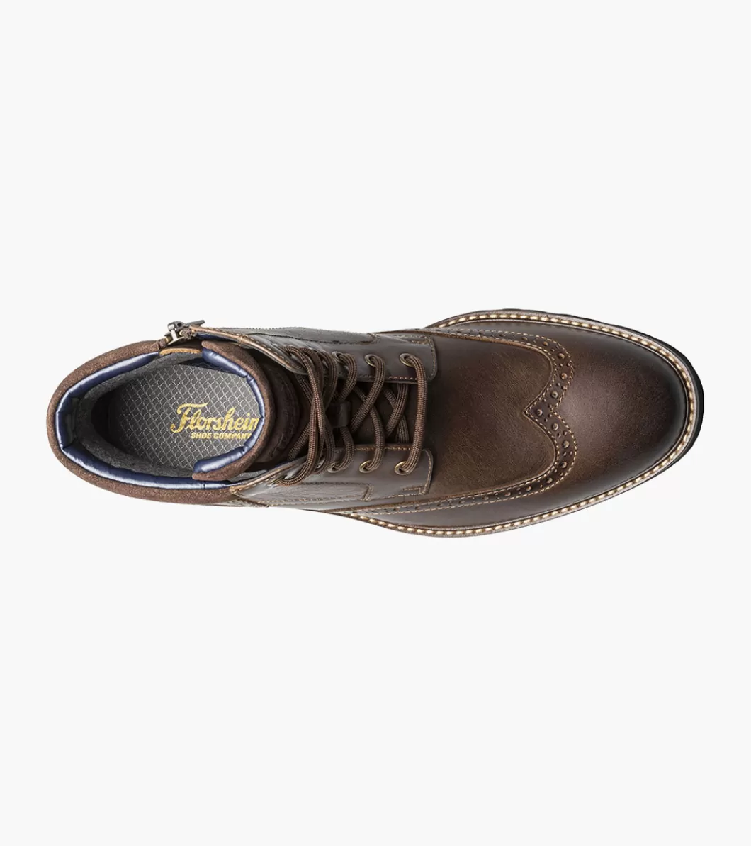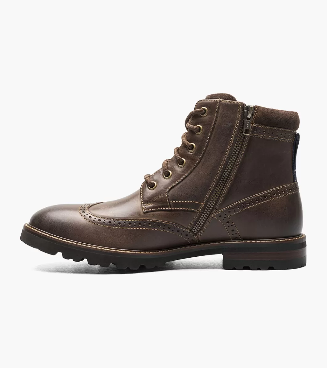The Florsheim Renegade Wingtip Lace Up Boot has a modern appeal thanks to its mixed material upper and a striking lug sole. This is a versatile style that can easily be dressed up or down.
